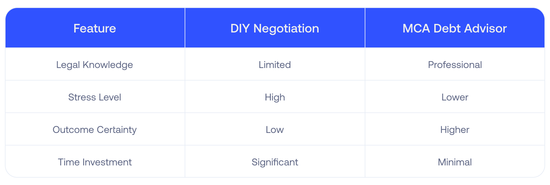 This quick comparison shows how working with an experienced advisor can reduce stress, improve outcomes, and save time compared to handling MCA debt alone.