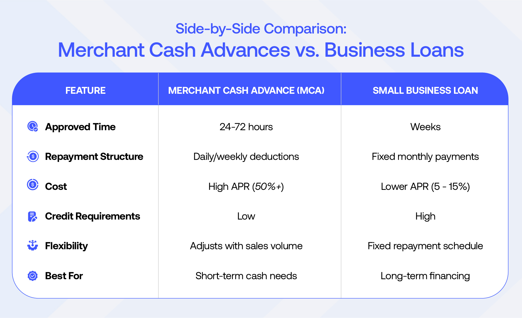 - Cost: Typically lower APRs than MCAs, often ranging from 5% to 15%.