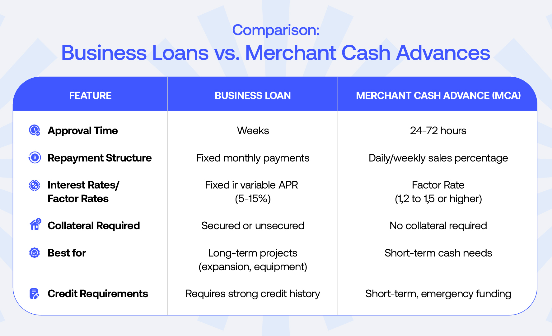 Typically, business loans have lower costs, especially for long-term needs, compared to MCAs, which can come with higher fees and factor rates.